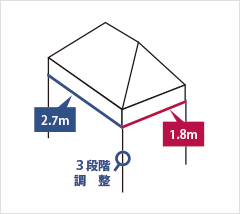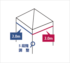| フレーム | オールアルミフレーム アルミ角パイプ(アルマイトコーティング処理) スチール+アルミ複合フレーム 柱部:アルミ角パイプ+アルマイトコーティング仕上げ トラスバー・ピークボール・ピークストラップ:スチール角パイプ+粉体焼付塗布処理 |
